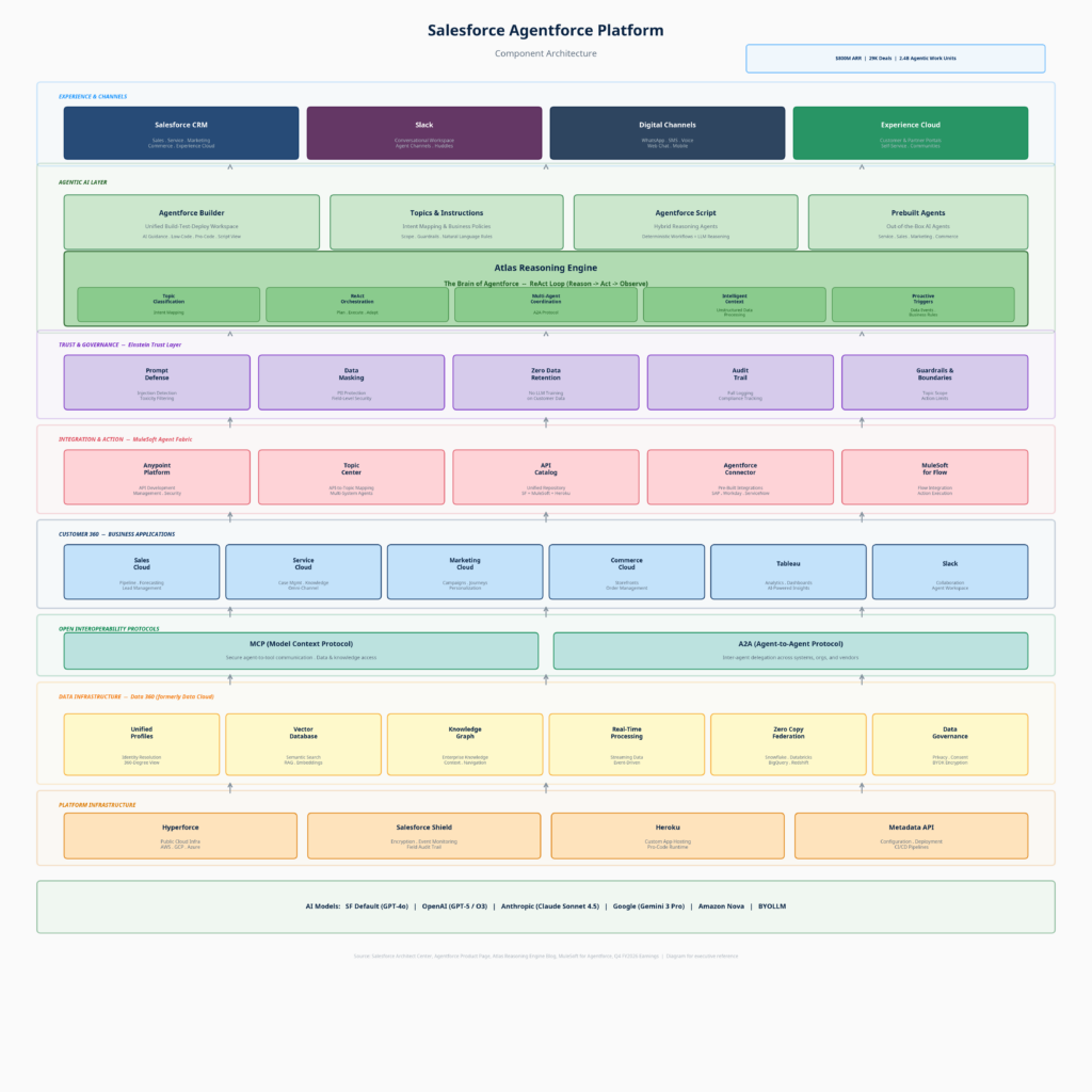 The Agentforce Platform operationalizes this through four layers:
