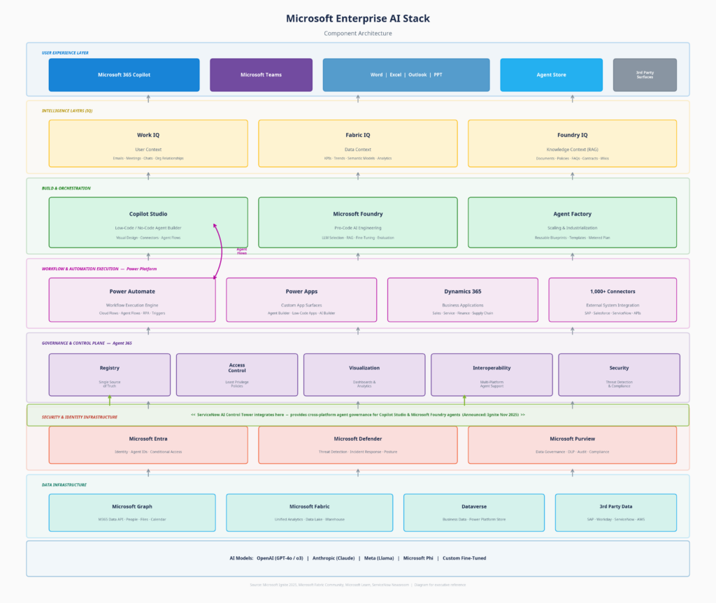 Notably, recognizing that enterprises operate across multiple clouds, Microsoft announced at Ignite 2025 that it uses ServiceNow AI Control Tower to govern all its AI agents. This integration connects directly into Agent 365’s registry and interoperability layers, allowing organizations to monitor, secure, and govern Microsoft agents (built in Copilot Studio or Foundry) from ServiceNow’s unified, cross-platform pane of glass.