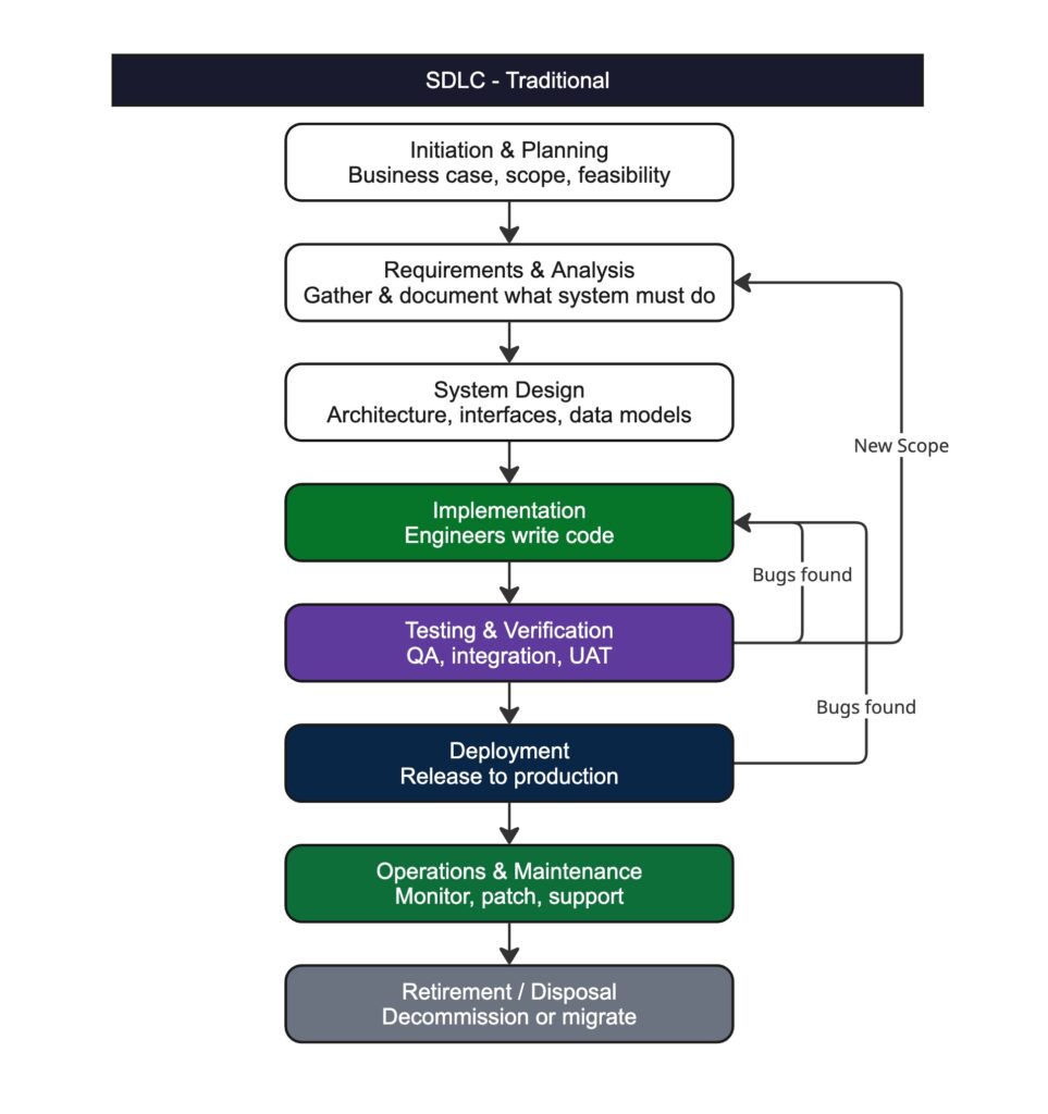 What it is: Sequential, phase-gated development. Requirements → Design → Implementation → Testing → Deployment → Maintenance → Retirement. Each phase must formally close before the next opens. Critically, SDLC covers the full system lifecycle — even when AI compresses the coding phase, all other phases still require human engineering judgment.