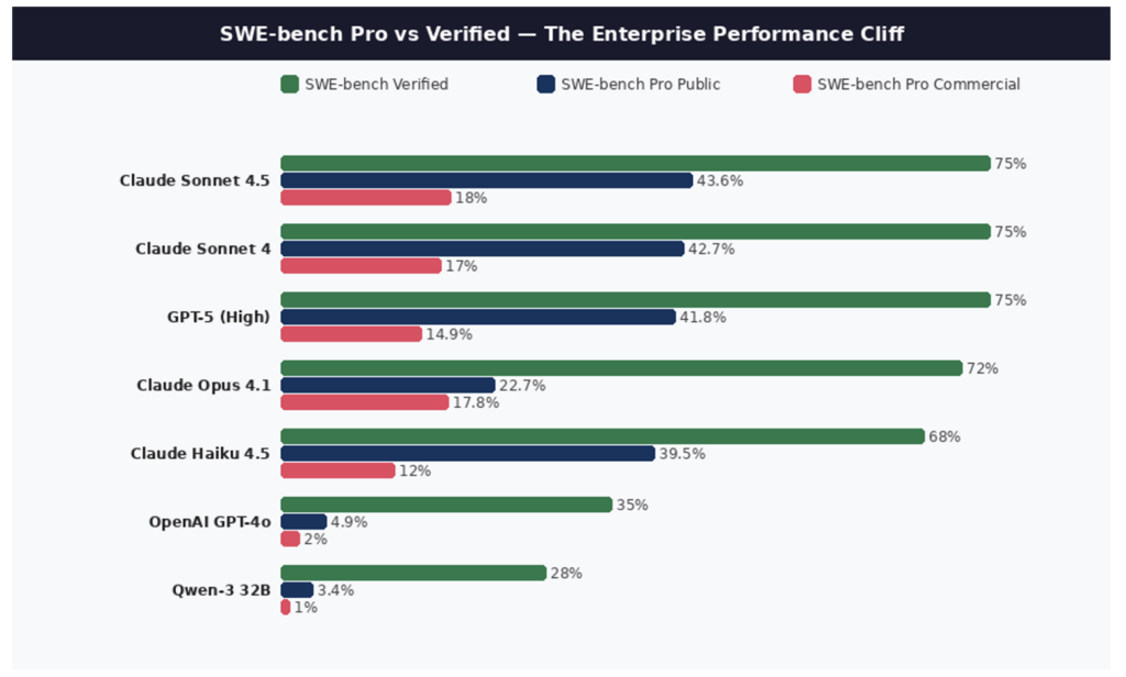 For comparison: those same models score 70%+ on SWE-bench Verified — the older benchmark used in most AI marketing materials. That gap is not a rounding error. It is structural.