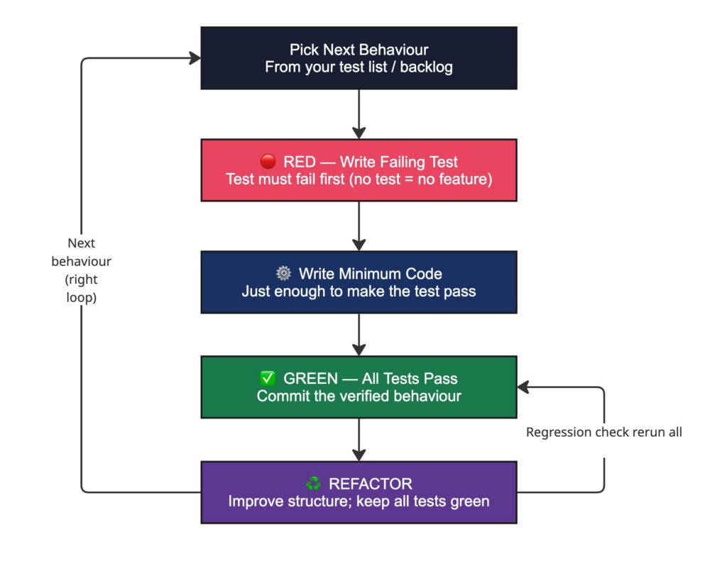 What it is: Write the failing test first. Write the minimum code to make it pass. Refactor. The test is the specification — an executable contract. Verification is pulled to the front of implementation.