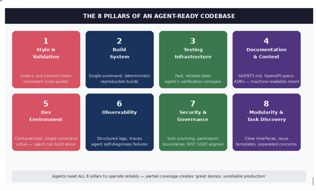 The core insight: agents cannot compensate for missing infrastructure the way humans can. Humans improvise around broken builds, absent docs, and opaque conventions. Agents cannot. That gap is why most teams see ‘great demos, unreliable production.’