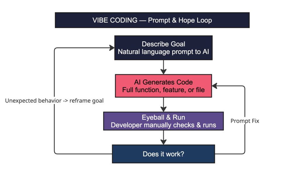 What it is: Prompt AI with a goal in natural language. Accept the generated code. Iterate with more prompts. Coined by Andrej Karpathy, February 2025. The core idea: delegate implementation to the model and steer via quick feedback.